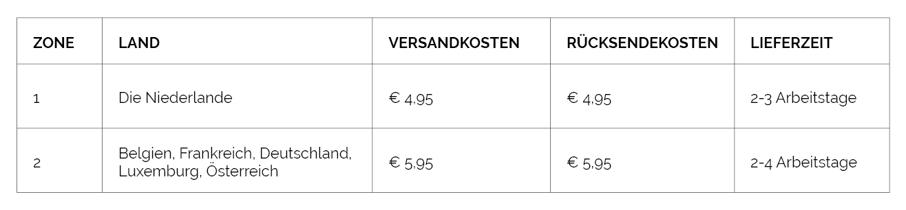 Werktags vor 15:00 Uhr bestellt? Wir versenden die Bestellung noch am selben Tag (sofern nicht anders angegeben). Alle Pakete werden mit DPD verschickt. Du erhältst eine E-Mail mit einem Sendungsverfolgungscode.