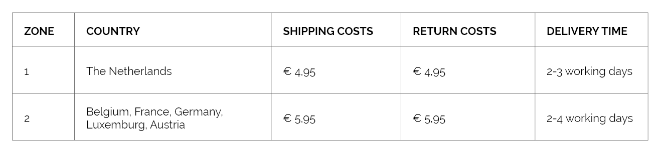 Ordered before 3:00 PM on weekdays? We'll ship your order the same day (unless otherwise indicated). All of our packages are sent with DPD. You will receive an email with a track & trace code.